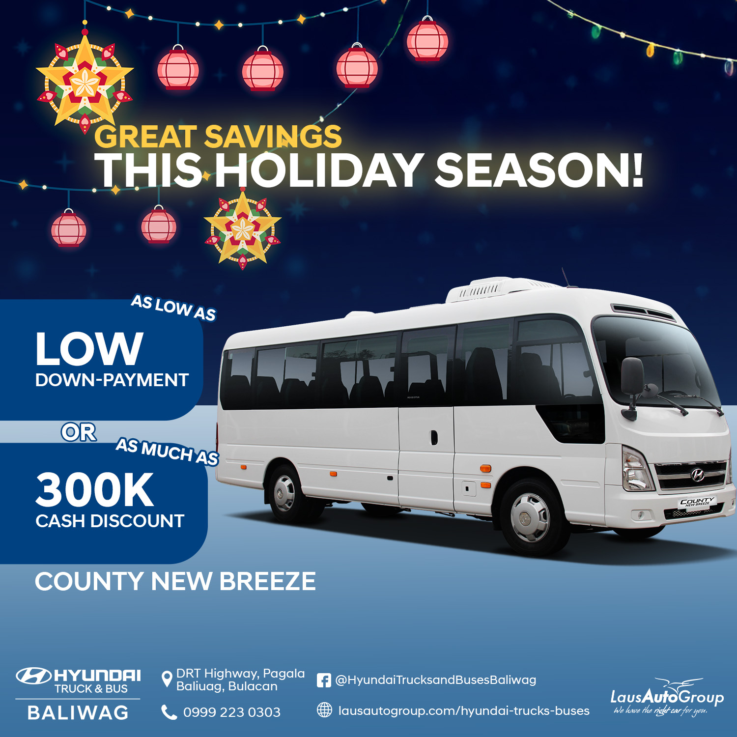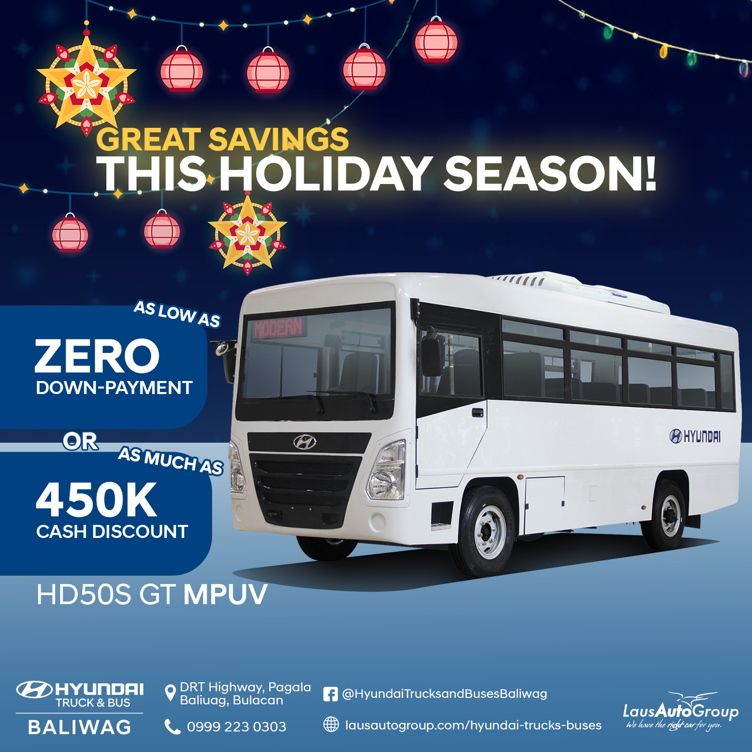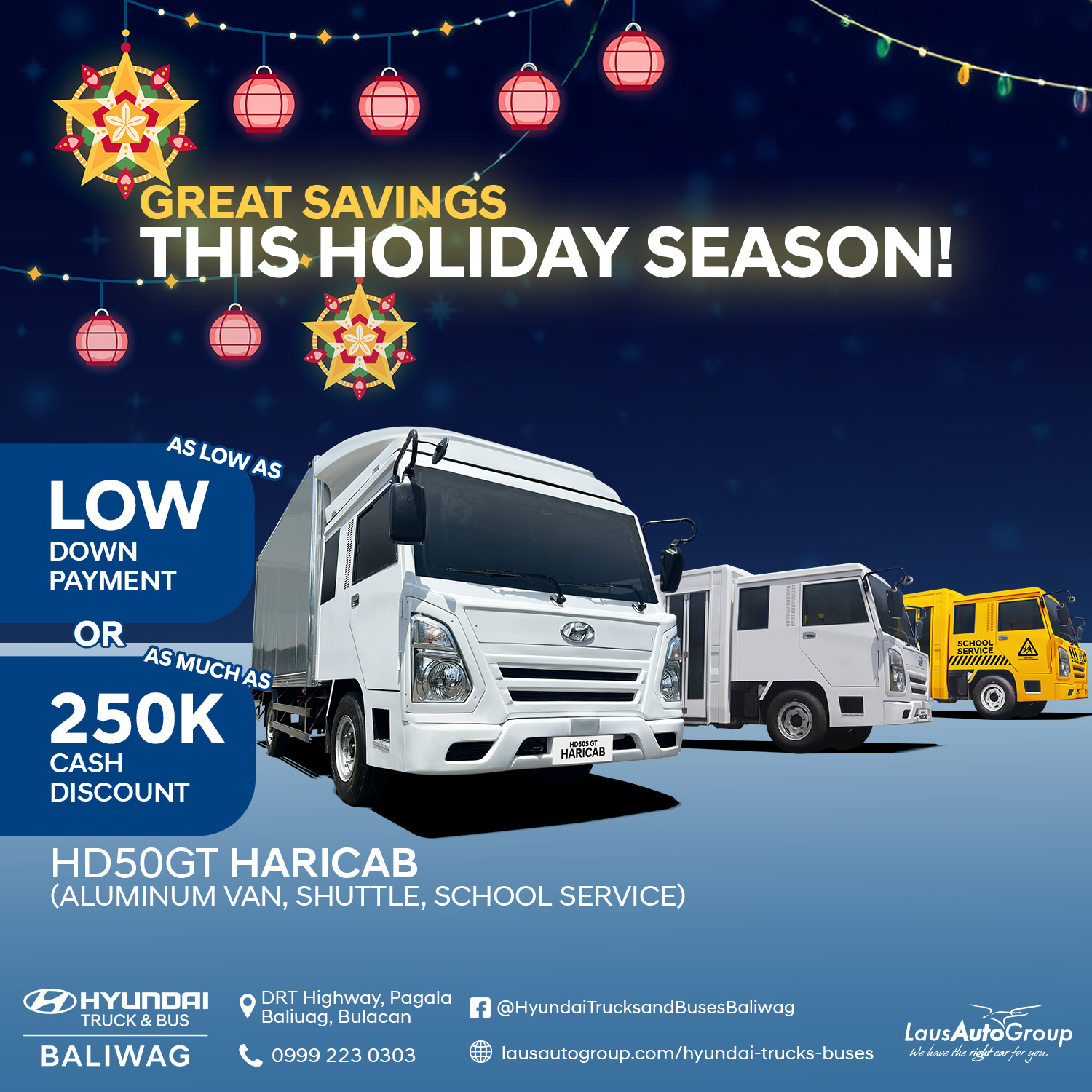 Enjoy a comfortable holiday season with big savings! Experience the #Hyundai Trucks and Buses with ๐ณ๐๐ซ๐จ down payment and receive up to โฑ๐๐๐๐ cash discount on selected models designed for journeys that connect people. ๐โจ