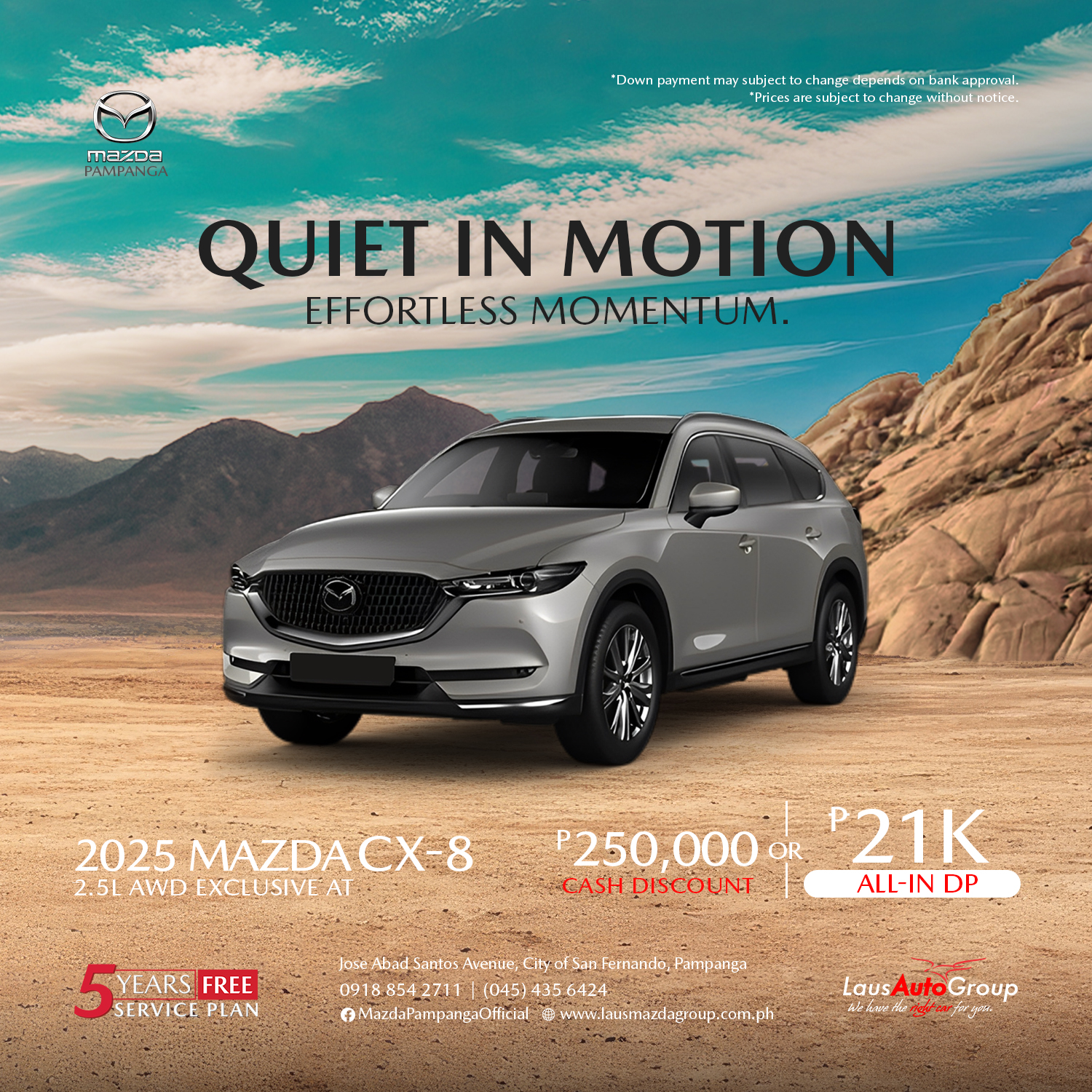 Experience refined performance with #Mazda, where comfort, power, and sophistication come together. Enjoy up to ₱𝟐𝟓𝟎𝐊 𝐜𝐚𝐬𝐡 𝐝𝐢𝐬𝐜𝐨𝐮𝐧𝐭 or drive yours home for only ₱𝟐𝟏𝐊 all-in 𝐝𝐨𝐰𝐧 𝐩𝐚𝐲𝐦𝐞𝐧𝐭 on select models.